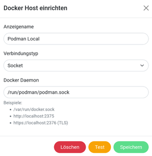 - Bei Verwendung von Podman muss man die Socket-Datei von Podman vom Host in den Container durchreichen und in den Admin-Settings anpassen.